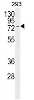 - ZNF630 Antibody (N-term) (AP54704PU-N) western blot analysis in 293 cell line lysates (35 µg/lane). This demonstrates the ZNF630 antibody detected the ZNF630 protein (arrow).