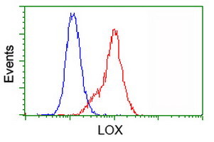 - Flow cytometric Analysis of Hela cells, using anti-LOX antibody(TA500863),(Red), compared to a nonspecific negative control antibody,(Blue).