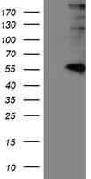 - HEK293T cells were transfected with the pCMV6-ENTRY control (Left lane) or pCMV6-ENTRY LOX (Right lane) cDNA for 48 hrs and lysed. Equivalent amounts of cell lysates (5 ug per lane) were separated by SDS-PAGE and immunoblotted with anti-LOX.