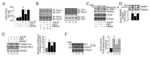 The Nox1/4 Dual Inhibitor GKT137831 or Nox4 Knockdown Inhibits Angiotensin-II-Induced Adult Mouse Cardiac Fibroblast Proliferation and Migration. AT1 Physically Associates With Nox4.