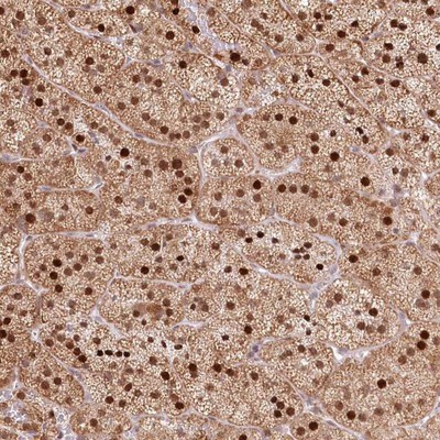 - Immunohistochemistry-Paraffin: PYURF Antibody [NBP1-82751] - Staining of human adrenal gland shows strong nuclear and cytoplasmic positivity in cortical cells.