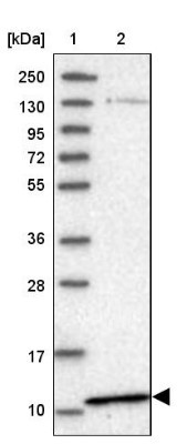 - Western Blot: PYURF Antibody [NBP1-82751] - Lane 1: Marker [kDa] 250, 130, 95, 72, 55, 36, 28, 17, 10. Lane 2: Human cell line RT-4