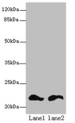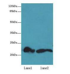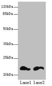 - Western blot. All lanes: FKBP11 antibody at 6 ug/ml. Lane 1: Mouse spleen tissue. Lane 2: Mouse liver tissue. Secondary Goat polyclonal to Rabbit IgG at 1:10000 dilution. Predicted band size: 22 kDa. Observed band size: 22 kDa.