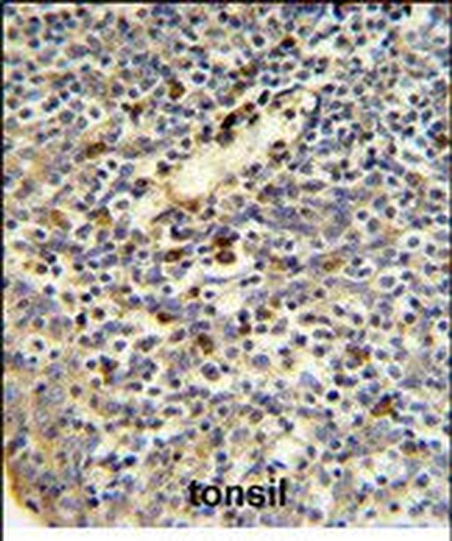 - Immunohistochemical analysis of FKBP11 in formalin fixed and paraffin embedded human tonsil tissue. Samples were probed with a FKBP11 Antibody (N-term) (Product # PA5-49587) followed by peroxidase conjugation of the secondary antibody and DAB staining.