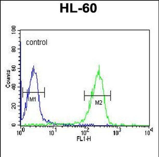 - Flow cytometric analysis of FKBP11 in HL-60 cells (right histogram) compared to a negative control cell (left histogram). Samples were probed with a FKBP11 Antibody (N-term) (Product # PA5-49587), followed by a FITC-conjugated goat anti-rabbit secondary antibody.