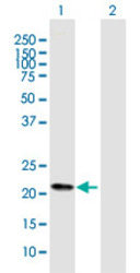 - Western Blot analysis of FKBP11 expression in transfected 293T cell line (H00051303-T02) by FKBP11 MaxPab polyclonal antibody.Lane 1: FKBP11 transfected lysate(22.20 KDa).Lane 2: Non-transfected lysate.