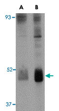 - Western blot analysis of WNT10B in human skeletal muscle tissue lysate with WNT10B polyclonal antibody (Cat # PAB13039) at (A) 2 and (B) 4 ug/mL .