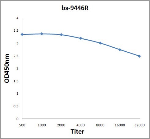 - Antigen: bs-9446P, 2ug/100ul Primary: Antiserum, 1:500, 1:1000, 1:2000, 1:4000, 1:8000, 1:16000, 1:32000; Secondary: HRP conjugated Rabbit Anti-Goat IgG(bs-0294R-HRP) at 1:5000; TMB staining; Read the data in Microplate Reader by 450nm.