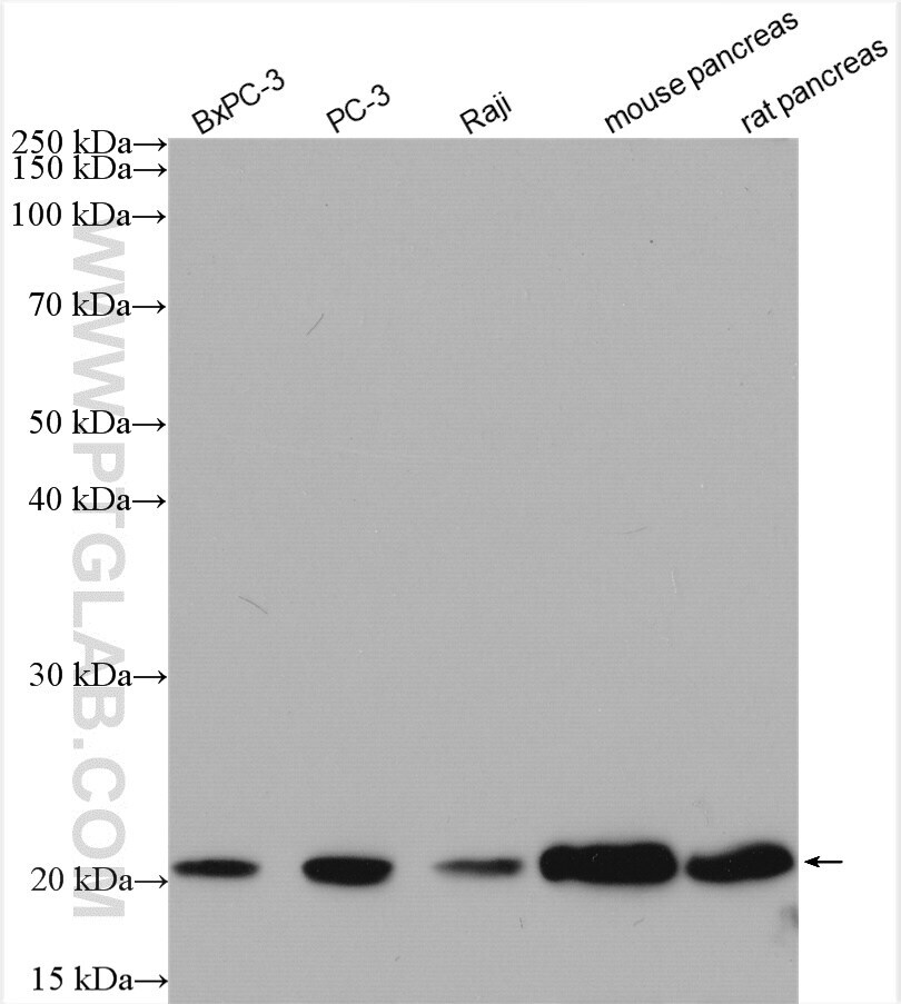 - Mouse pancreas tissue were subjected to SDS PAGE followed by western blot with 15199-1-AP (TMP21 antibody) at dilution of 1:1000 incubated at room temperature for 1.5 hours.