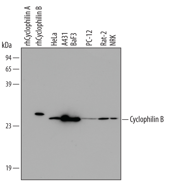 - Detection of Human/Mouse/Rat Cyclophilin B by Western Blot. Western blot shows lysates of HeLa human cervical epithelial carcinoma cell line, A431 human epithelial carcinoma cell line, BaF3 mouse pro-B cell line, PC-12 rat adrenal pheochromocytoma cell line, Rat-2 rat embryonic fibroblast cell line, and NRK rat normal kidney cell. PVDF membrane was probed with 1 µg/mL Mouse Anti-Human/Mouse/ Rat Cyclophilin B Monoclonal Antibody (Catalog # MAB5410) followed by HRP-conjugated Anti-Mouse IgG Secondary Antibody (Catalog # HAF007). For additional reference, recombinant human Cyclophilin A and Cyclophilin B (5 ng/lane) were included. A specific band for Cyclophilin B was detected at approximately 24 kDa (as indicated). This experiment was conducted under reducing conditions and using Immunoblot Buffer Group 3.