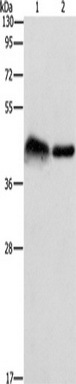 - Gel: 10%SDS-PAGE, Lysate: 40 ug, Lane 1-2: Mouse bladder tissue, 293T cells, Primary antibody: (CRELD1 Antibody) at dilution 1/930, Secondary antibody: Goat anti rabbit IgG at 1/8000 dilution, Exposure time: 5 minutes