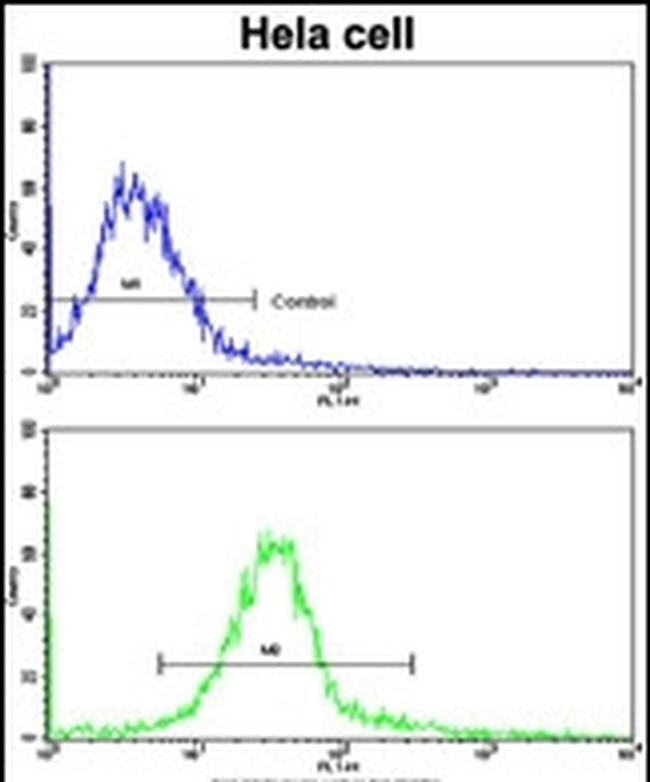 - Flow cytometry analysis of ERAS in HeLa cells (bottom histogram) compared to a negative control cell (top histogram). Samples were incubated with ERAS polyclonal antibody (Product # PA5-71907) followed by a FITC conjugated goat anti-rabbit secondary antibody.