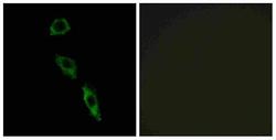 - Western blot analysis of lysates from Jurkat cells, using ERAS Antibody. The lane on the right is blocked with the synthesized peptide.