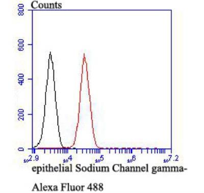 - Flow Cytometry: epithelial Sodium Channel gamma Antibody [NBP2-76964] - Flow cytometric analysis of 293T cells with SCNN1G antibody at 1/100 dilution (red) compared with an unlabelled control (cells without incubation with primary antibody; black). Alexa Fluor 488-conjugated goat anti-rabbit IgG was used as the secondary antibody.