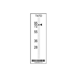 - ZNF69 Antibody (C-term) (Cat. #OAAB07965) western blot analysis in T47D cell line lysates (35µg/lane).This demonstrates the ZNF69 antibody detected the ZNF69 protein (arrow).