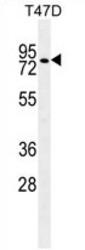 - ZNF69 Antibody (C-term) (AP54713PU-N) western blot analysis in T47D cell line lysates (35 µg/lane). This demonstrates the ZNF69 antibody detected the ZNF69 protein (arrow).