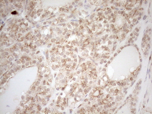 - Immunohistochemical staining of paraffin-embedded Human thyroid tissue using anti-ZNF69 mouse monoclonal antibody.(Heat-induced epitope retrieval by 1mM EDTA in 10mM Tris buffer (pH8.5) at 120°C for 3 min, TA808236)(1:150)