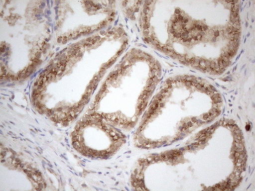 - Immunohistochemical staining of paraffin-embedded Human prostate tissue using anti-ZNF69 mouse monoclonal antibody. (Heat-induced epitope retrieval by 1mM EDTA in 10mM Tris buffer (pH8.5) at 120°C for 3 min, TA808236)(1:150)