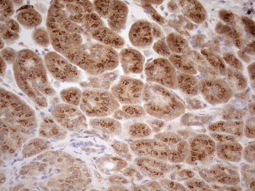 - Immunohistochemical staining of paraffin-embedded Carcinoma of Human pancreas tissue using anti-ZNF69 mouse monoclonal antibody. (Heat-induced epitope retrieval by 1mM EDTA in 10mM Tris buffer (pH8.5) at 120°C for 3 min, TA808236)(1:150)
