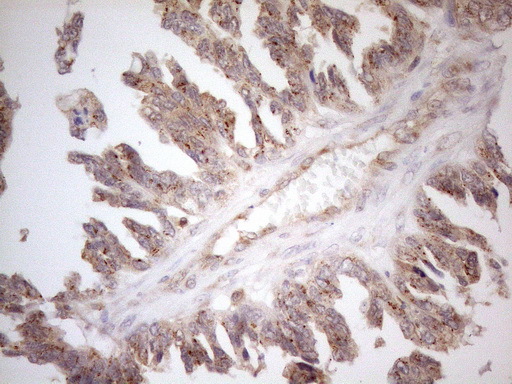- Immunohistochemical staining of paraffin-embedded Adenocarcinoma of Human ovary tissue using anti-ZNF69 mouse monoclonal antibody.(Heat-induced epitope retrieval by 1mM EDTA in 10mM Tris buffer (pH8.5) at 120°C for 3 min, TA808236)(1:150)