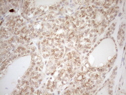 - Immunohistochemical staining of paraffin-embedded Carcinoma of Human thyroid tissue using anti-ZNF69 mouse monoclonal antibody.(Heat-induced epitope retrieval by 1mM EDTA in 10mM Tris buffer (pH8.5) at 120°C for 3 min, TA808236)(1:150)
