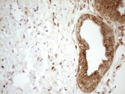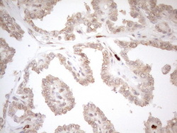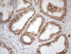 - Immunohistochemical staining of paraffin-embedded Carcinoma of Human prostate tissue using anti-ZNF69 mouse monoclonal antibody.(Heat-induced epitope retrieval by 1mM EDTA in 10mM Tris buffer (pH8.5) at 120°C for 3 min, TA808236)(1:150)