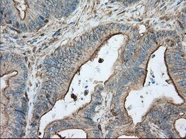 - Immunohistochemical staining of paraffin-embedded Adenocarcinoma of colon tissue using anti-ALDH3A1 mouse monoclonal antibody. (Heat-induced epitope retrieval by 10mM citric buffer, pH6.0, 100°C for 10min, TA501105, Dilution 1:50)