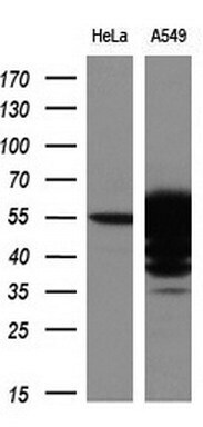 - Western blot analysis of extracts (10 µg) from 2 different cell lines by using anti-ALDH3A1 monoclonal antibody at 1:200 dilution.