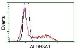 - HEK293T cells transfected with either pCMV6-ENTRY ALDH3A1(RC202440)(Red) or empty vector control plasmid (Blue) were immunostained with anti-ALDH3A1 mouse monoclonal(TA501105), and then analyzed by flow cytometry.