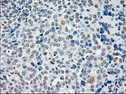- Immunohistochemical staining of paraffin-embedded Adenocarcinoma of breast tissue using anti-STK3 mouse monoclonal antibody. (Dilution 1:50).
