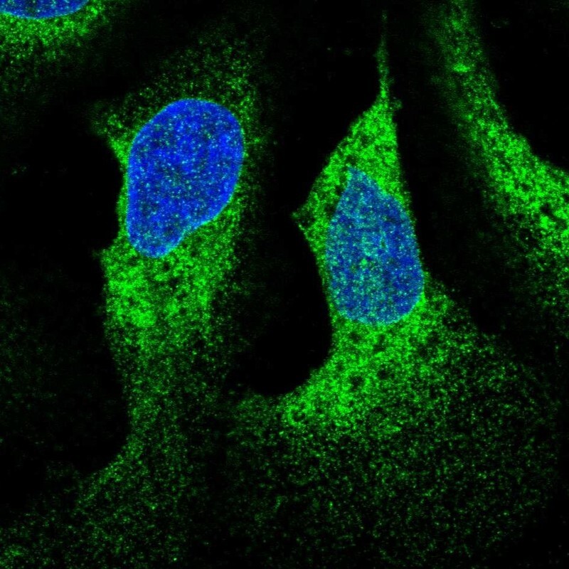 - Immunofluorescent staining of human cell line U-2 OS shows localization to nuclear membrane & endoplasmic reticulum.