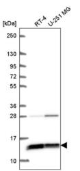 - Western blot analysis of WDR83OS in human cell line RT-4 and human cell line U-251 MG. Samples were probed using a WDR83OS Polyclonal Antibody (Product # PA5-66788).