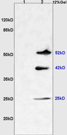 - L1 mouse liver lysates L2 mouse brain lysates probed with Anti NGX6/C9orf127 Polyclonal Antibody, Unconjugated (bs-1065R) at 1:200 overnight at 4°C. Followed by conjugation to secondary antibody (bs-0295G-HRP) at 1:3000 for 90 min at 37°C. Predicted band 52 kD. Observed band size:52 kD,42 kD,25 kD.