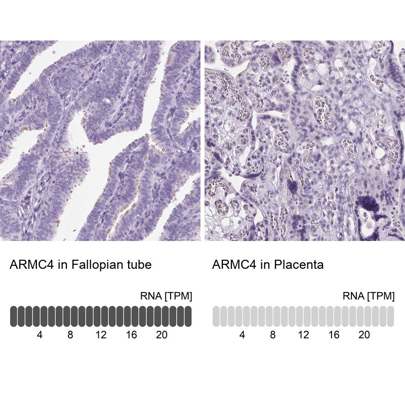 - Immunohistochemical staining of ARMC4 in human fallopian tube and placenta tissues using ARMC4 Polyclonal Antibody (Product # PA5-58129). Corresponding ARMC4 RNA-seq data are presented for the same tissues.