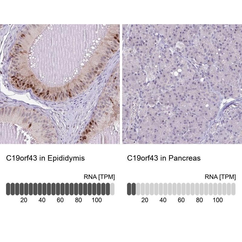- Immunohistochemistry analysis in human epididymis and pancreas tissues using HPA059965 antibody. Corresponding C19orf43 RNA-seq data are presented for the same tissues.