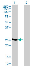 - Western Blot analysis of C19orf43 expression in transfected 293T cell line (H00079002-T01) by C19orf43 MaxPab polyclonal antibody.Lane 1: MGC2803 transfected lysate(19.36 KDa).Lane 2: Non-transfected lysate.