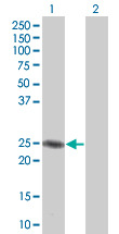 - Western Blot analysis of C19orf43 expression in transfected 293T cell line (H00079002-T01) by C19orf43 MaxPab polyclonal antibody.Lane 1: MGC2803 transfected lysate(19.36 KDa).Lane 2: Non-transfected lysate.