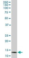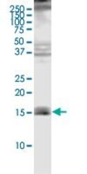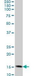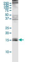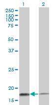 - Western Blot analysis of TOMM20 expression in transfected 293T cell line by TOMM20 monoclonal antibody (M01), clone 4F3.Lane 1: TOMM20 transfected lysate(16.3 KDa).Lane 2: Non-transfected lysate.