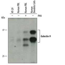 - Detection of Human Galectin-9 by Western Blot. Western blot shows conditioned media from HT-29 human colon adenocarcinoma cell line, human peripheral blood lymphocytes (PBL), and human dendritic cells untreated (-) or treated (+) with 10 µg/mL PHA for 6 days. PVDF membrane was probed with 1 µg/mL of Goat Anti-Human Galectin-9 Antigen Affinity-purified Polyclonal Antibody (Catalog # AF2045) followed by HRP-conjugated Anti-Goat IgG Secondary Antibody (Catalog # HAF109). Specific bands were detected for Galectin-9 at approximately 36 and 40 kDa. This experiment was conducted under reducing conditions and using Immunoblot Buffer Group 1.