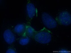 - Immunofluorescent analysis of ( -20°C Ethanol) fixed HeLa cells using 17938-1-AP (Galectin 9 antibody) at dilution of 1:50 and Alexa Fluor 488-conjugated AffiniPure Goat Anti-Rabbit IGG (H+L).