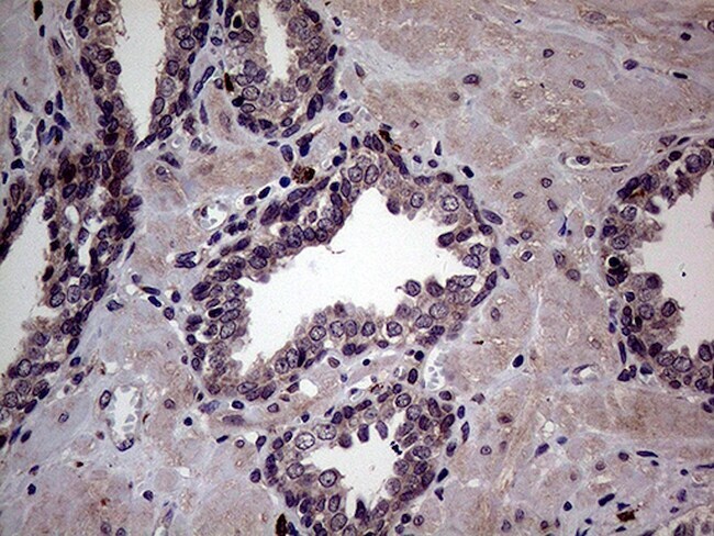 - Immunohistochemical staining of paraffin-embedded human prostate tissue within the normal limits using anti-MAPK8IP1 mouse monoclonal antibody. (Heat-induced epitope retrieval by 1mM EDTA in 10mM Tris buffer (pH8.5) at 120°C for 3 min, TA809895)(1:150).