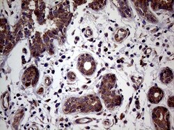 - Immunohistochemical staining of paraffin-embedded human breast tissue within the normal limits using anti-MAPK8IP1 mouse monoclonal antibody. (Heat-induced epitope retrieval by 1mM EDTA in 10mM Tris buffer (pH8.5) at 120°C for 3 min, TA809895)(1:150).
