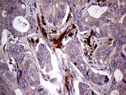 - Immunohistochemical staining of paraffin-embedded Adenocarcinoma of Human breast tissue tissue using anti-MAPK8IP1 mouse monoclonal antibody. (Heat-induced epitope retrieval by 1mM EDTA in 10mM Tris buffer (pH8.5) at 120°C for 3 min, TA809895)(1:150).