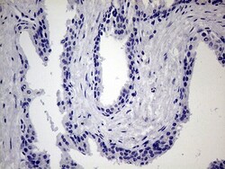 - Immunohistochemical staining of paraffin-embedded Carcinoma of Human prostate tissue using anti-MAPK8IP1 mouse monoclonal antibody. This figure shows negative staining. (Heat-induced epitope retrieval by 1mM EDTA in 10mM Tris buffer (pH8.5) at 120°C for 3 min, TA809895)(1:150).