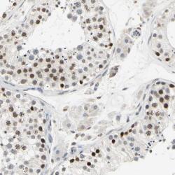 - Immunohistochemical staining of human testis shows distinct nuclear positivity in cells in seminiferus ducts.