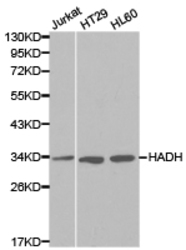 - Western blot analysis of extracts of variouscell lines, using HADH antibody.