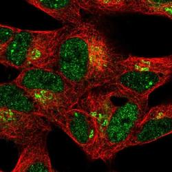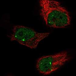 - Immunofluorescent staining of ZBTB5 in human cell line HeLa using a ZBTB5 Polyclonal Antibody (Product # PA5-54437) shows localization to nucleoplasm and nuclear bodies.