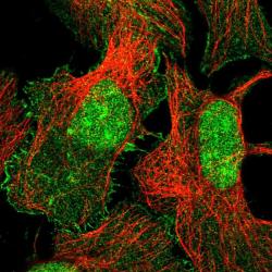 - Immunofluorescent staining of human cell line U-2 OS shows localization to nucleus, nucleoli & plasma membrane.