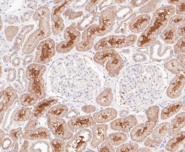 - Immunohistochemical analysis of CLSTN1 in paraffin-embedded human kidney tissue using a monoclonal antibody (Product #MA5-36139). The section was pre-treated using heat mediated antigen retrieval with sodium citrate buffer (pH 6.0) for 20 minutes. The tissues were blocked in 5% BSA for 30 minutes at room temperature, washed with ddH2O and PBS, and then probed with the primary antibody (1:200) for 30 minutes at room temperature. The detection was performed using an HRP conjugated compact polymer system. DAB was used as the chromogen. Tissues were counterstained with hematoxylin and mounted with DPX.