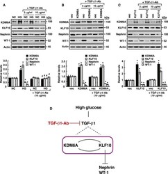 - Figure EV5 Addition of a TGF -beta1-neutralizing antibody has no significant effects on the positive inter-regulation between KDM 6A and KLF 10 in podocytes A Effects of TGF-beta1 neutralization on high glucose-mediated gene expression. Podocytes cultured in normal or high glucose were treated with different doses (3 and 10 mug/mL) of TGF-beta1-neutralizing antibody (MAB240, R&D Systems) for 48 h. Relative protein levels of KDM6A, KLF10, nephrin, and WT-1 in these treated podocytes were analyzed by Western blot analysis. * P < 0.05 versus normal controls, # P < 0.05 versus podocytes in high glucose (parametric ANOVA and a Bonferroni post hoc test; n = 3). B Effects of TGF-beta1 neutralization on KDM6A-mediated gene expression. Podocytes transfected with an empty vector or KDM6A-expressing plasmid were treated with different doses (3 and 10 mug/mL) of TGF-beta1 neutralizing antibody (MAB240, R&D Systems) for 48 h. Relative expression levels of KDM6A, KLF10, nephrin, and WT-1 in these treated podocytes were analyzed by Western blot analysis. * P < 0.05 versus podocytes transfected with an empty vector (parametric ANOVA and a Bonferroni post hoc test; n = 3). C Effects of TGF-beta1 neutralization on KLF10-mediated gene expression. Podocytes transfected with an empty vector or KLF10-expressing plasmid were treated with different concentrations (3 and 10 mug/mL) of TGF-beta1 neutralizing antibody (MAB240, R&D Systems) for 48 h. Relative expression levels of KDM6A, KLF10, nephrin,